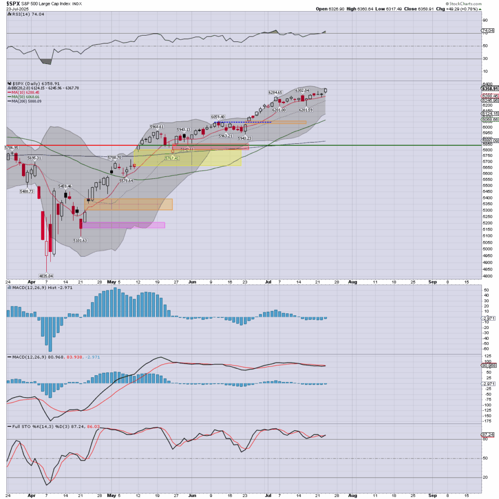 US equity indexes closed broadly higher, SPX +49pts (0.8%) at 6358. Nasdaq comp’ +0.6%. Dow +1.1%. The Transports settled +1.0%. R2K +1.5%