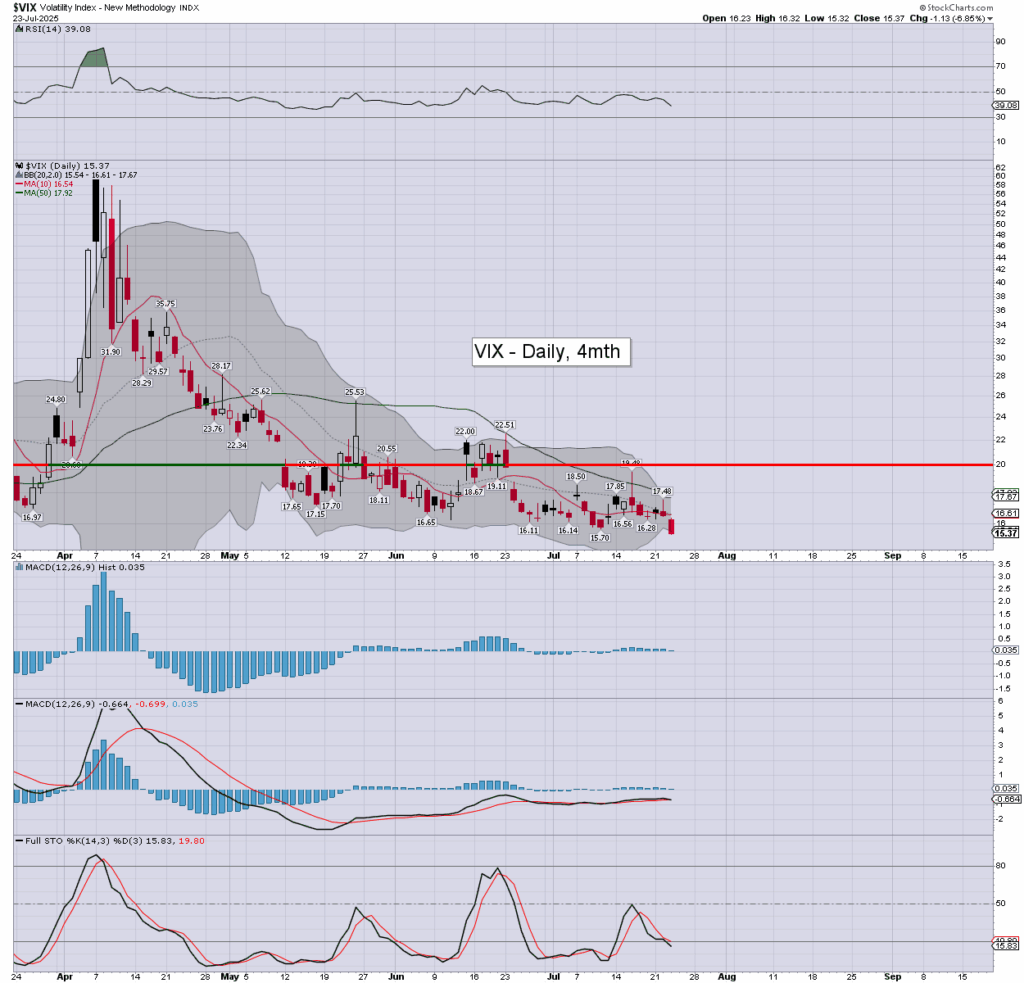 Volatility was ground lower for the fifth day of six, the VIX printing a new multi-month low of 15.32, settling -6.8% to 15.37. Daily momentum remains fractionally positive.
