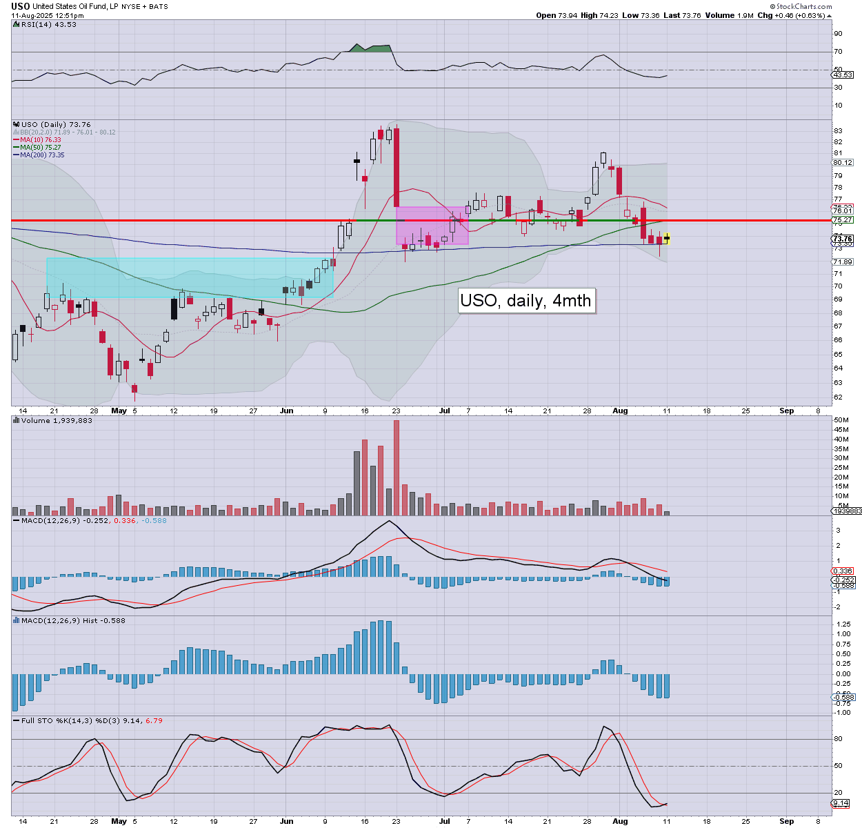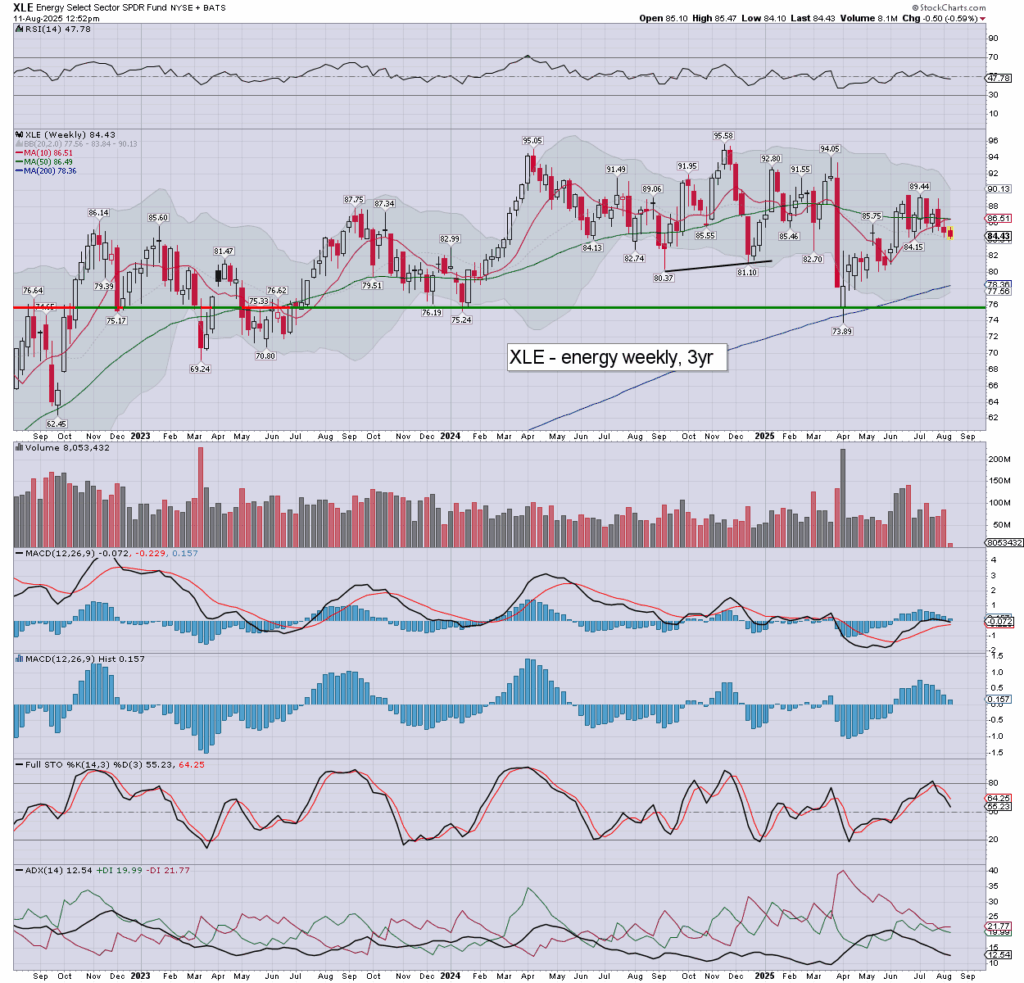 XLE: energy stocks are moderately lower. Weekly momo is prone to turning negative next Monday.