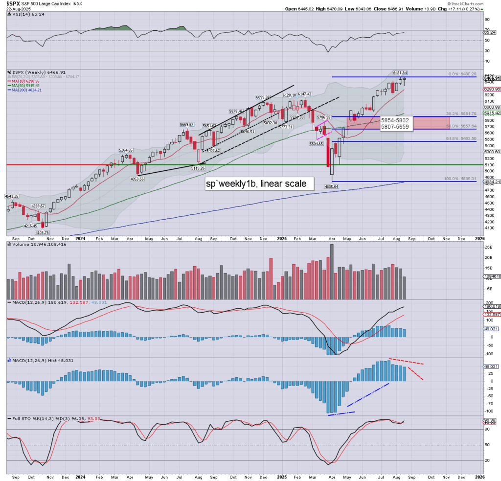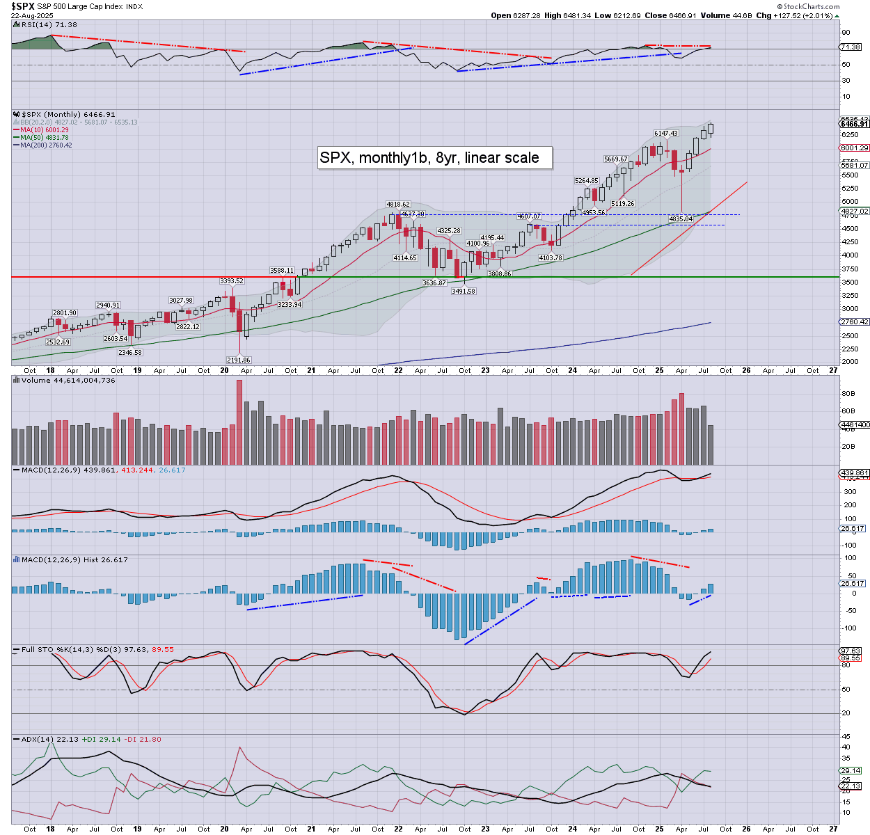 With five trading days left of August, the SPX is currently +127pts (2.0%) at 6466, having recently printed a new hist’ high of 6481. M/t bullish… unless a monthly settlement below the key 10MA, currently 6001.