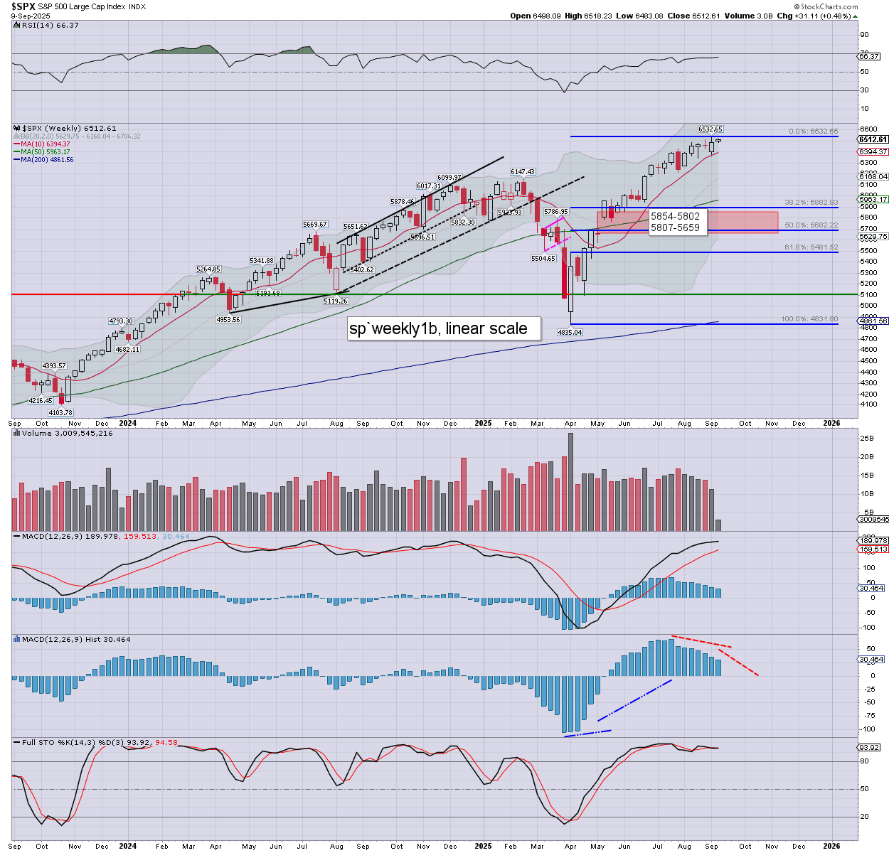 SPX: weekly momentum continues to weaken, still prone to turning negative by end month. On a break… basic downside target is around 6K
