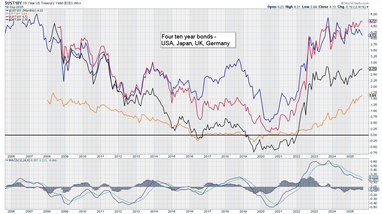 First, note the UK 10yr gilt (or bond)… 4.72%. Why would anyone not expect this to break >5.00% ? Here… its the fourth year of stagflation, a disintegrating society and economy. There is an ‘autumn budget’ due Nov’26th, and it threatens major civil and economic turmoil.