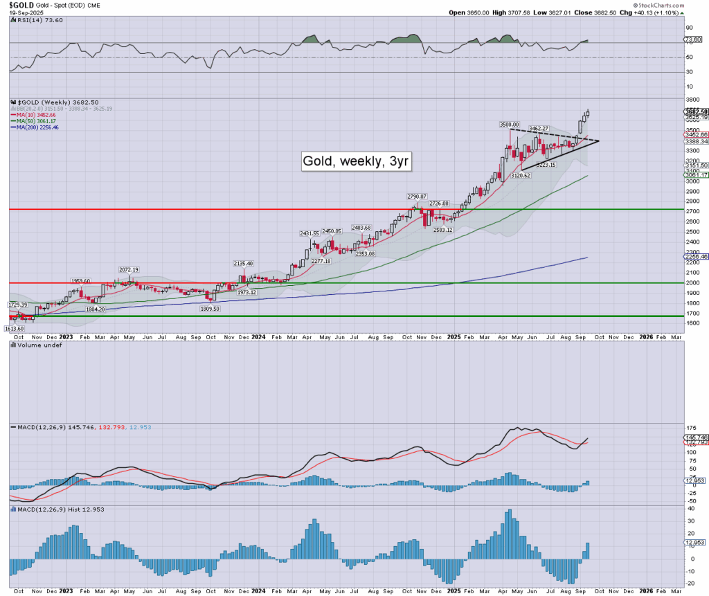 Gold this week printed a new hist’ high of the $3707s. Weekly momentum is on the moderately high side, RSI 73s.