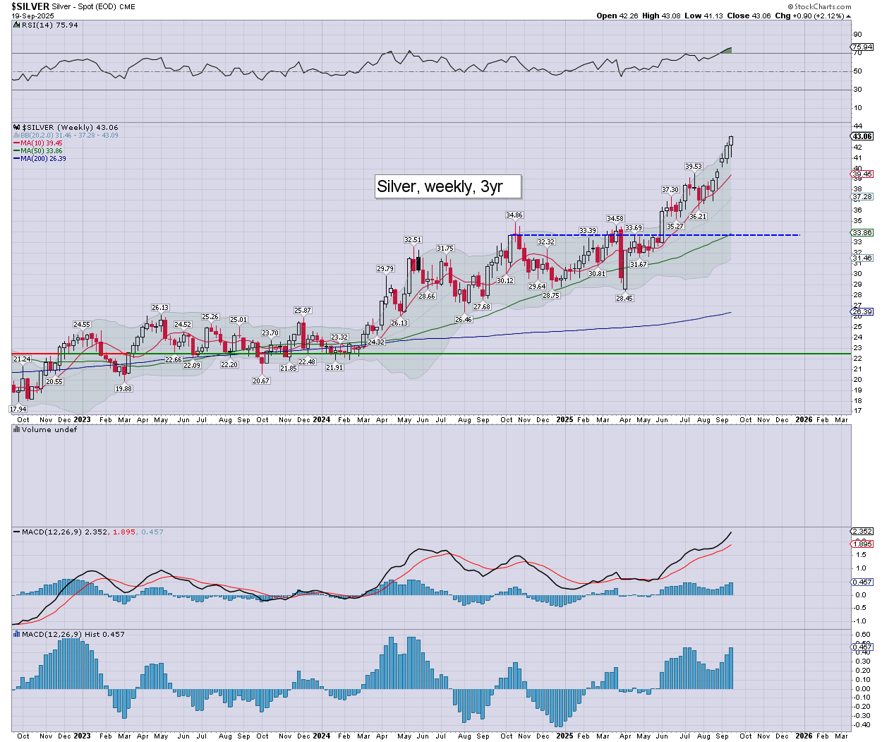 Silver printed the low $43s on Friday. Its cyclically high on the weekly, with RSI 75s. I don’t expect a burst >$50 this side of Halloween.