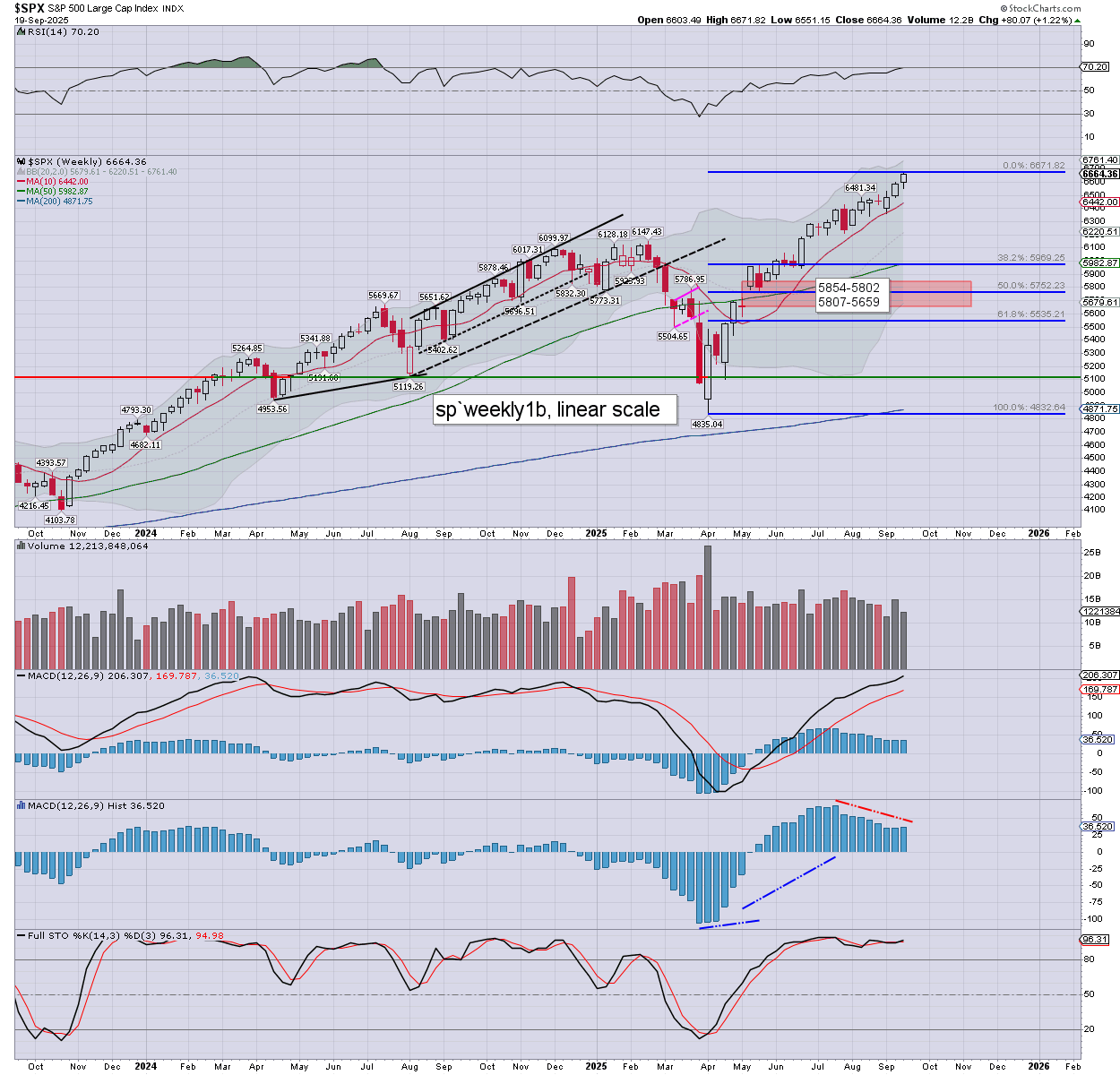 SPX: … clearly… a net bullish week, with the fib’ chart (yet again) adjusted upward. Weekly momentum ticked a little higher, and remains on the moderately high side. Weekly RSI 70s… the highest since July 2024, just before there was a four week cooling wave of around 10%.