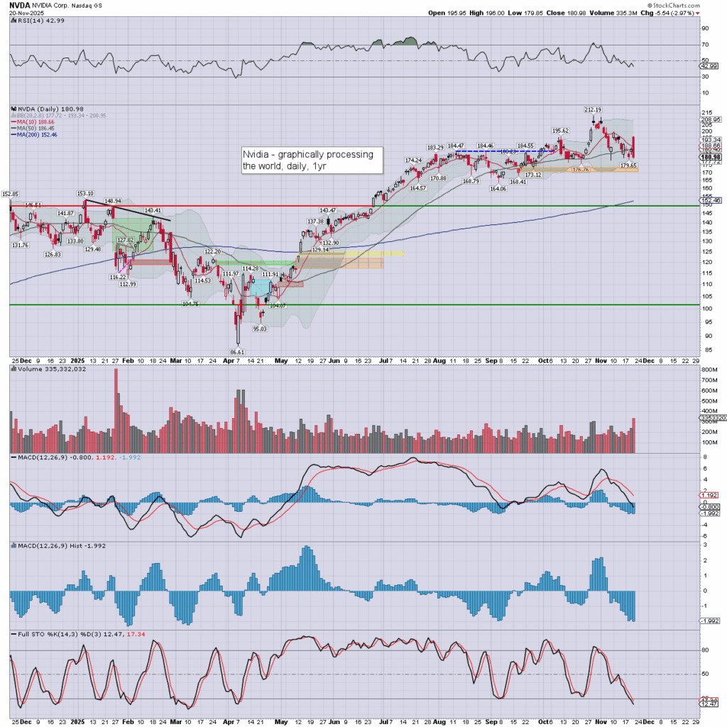 Nvidia saw an early high of $196.00, but swung powerfully lower, settling -3.0% to $180.98. Today’s candle is bearish engulfing, and I’d note the 200dma in the $152s.