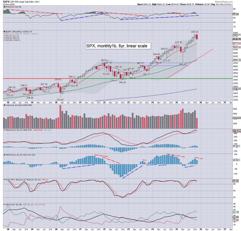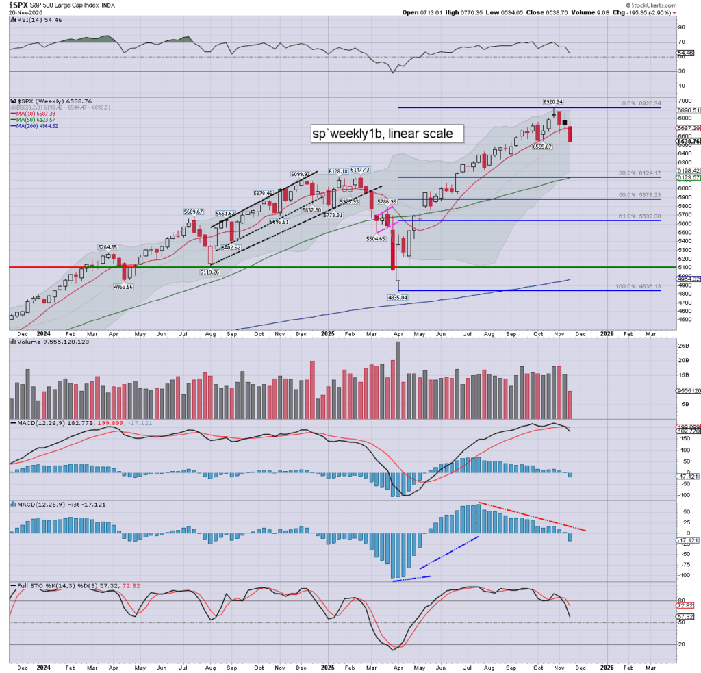 SPX: as things are, we’re net lower for the week by -195pts (2.9%). Weekly momentum is sustainably negative, and should be increasingly negative into mid/late December.