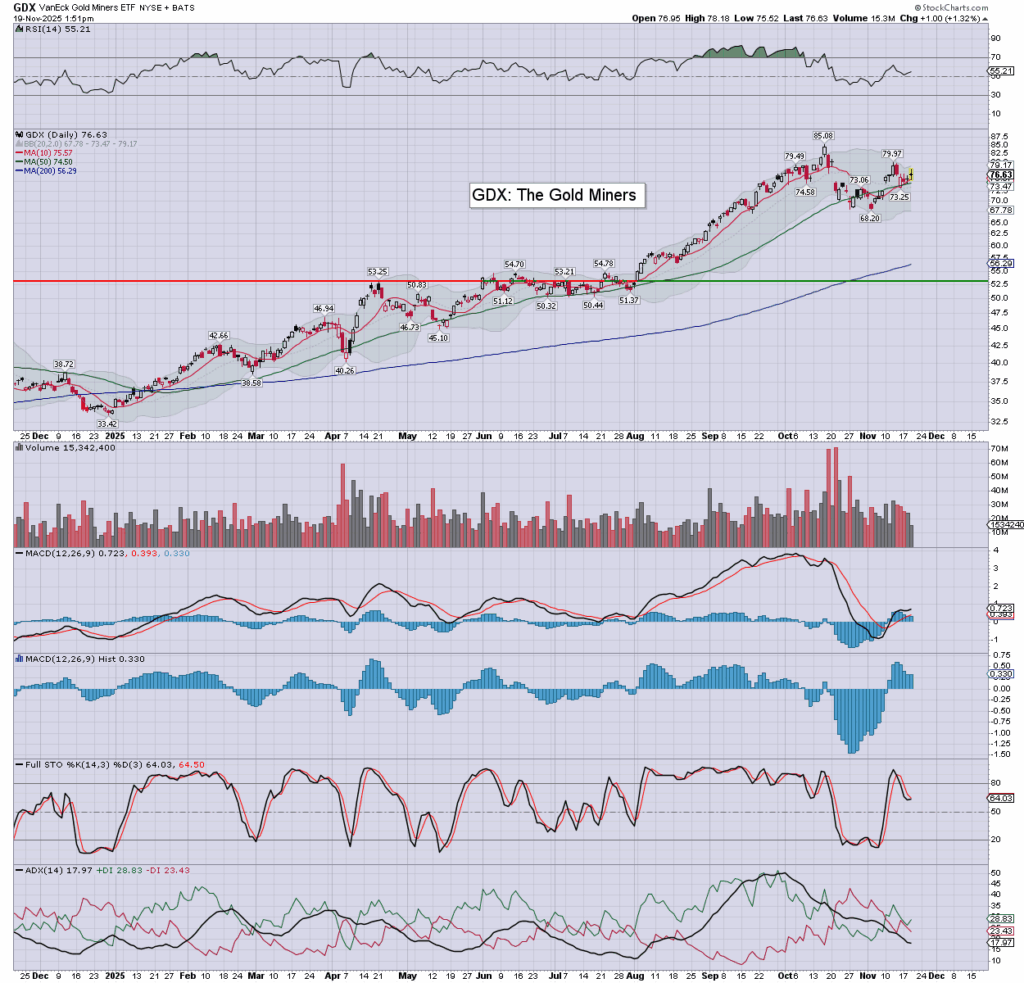 US equities are struggling. Meanwhile, the precious metals are leaning upward, Gold +$12 (0.3%), with Silver +43cents (0.9%). The miner ETF of GDX is currently +1.2% at $76.56.