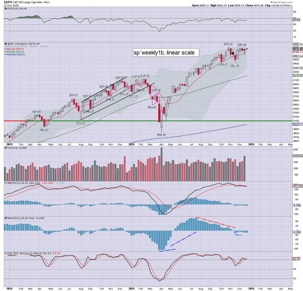 SPX: weekly momentum remains marginally negative. Bulls can argue its a sign the bears can’t muster anything significant/sustained. Upper weekly bollinger is offering a new hist’ high at 6969.