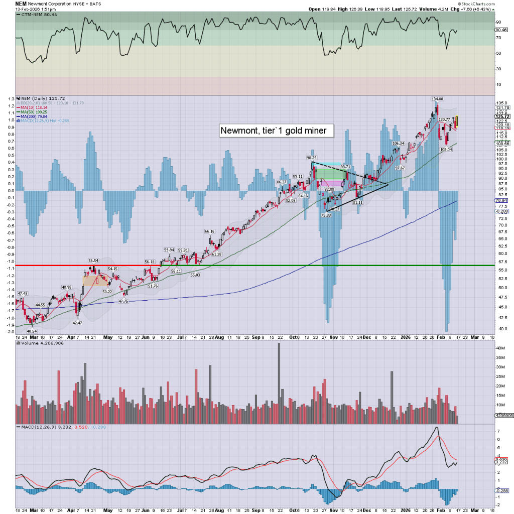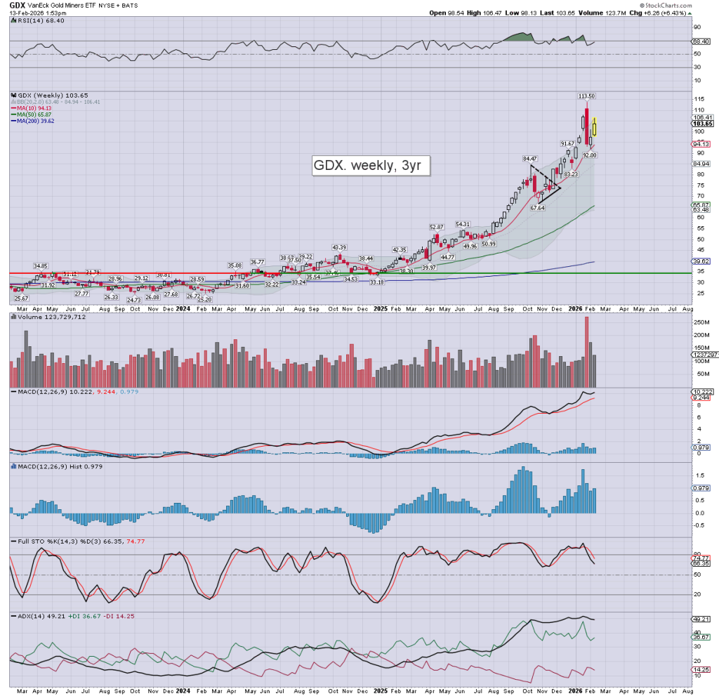 US equities are a little choppy, if mostly leaning upward. Meanwhile, the precious metals are sig’ higher, Gold +$109 (2.4%), with Silver +$2.59 (3.8%). The miner ETF of GDX is currently +5.5% at $105.65.
