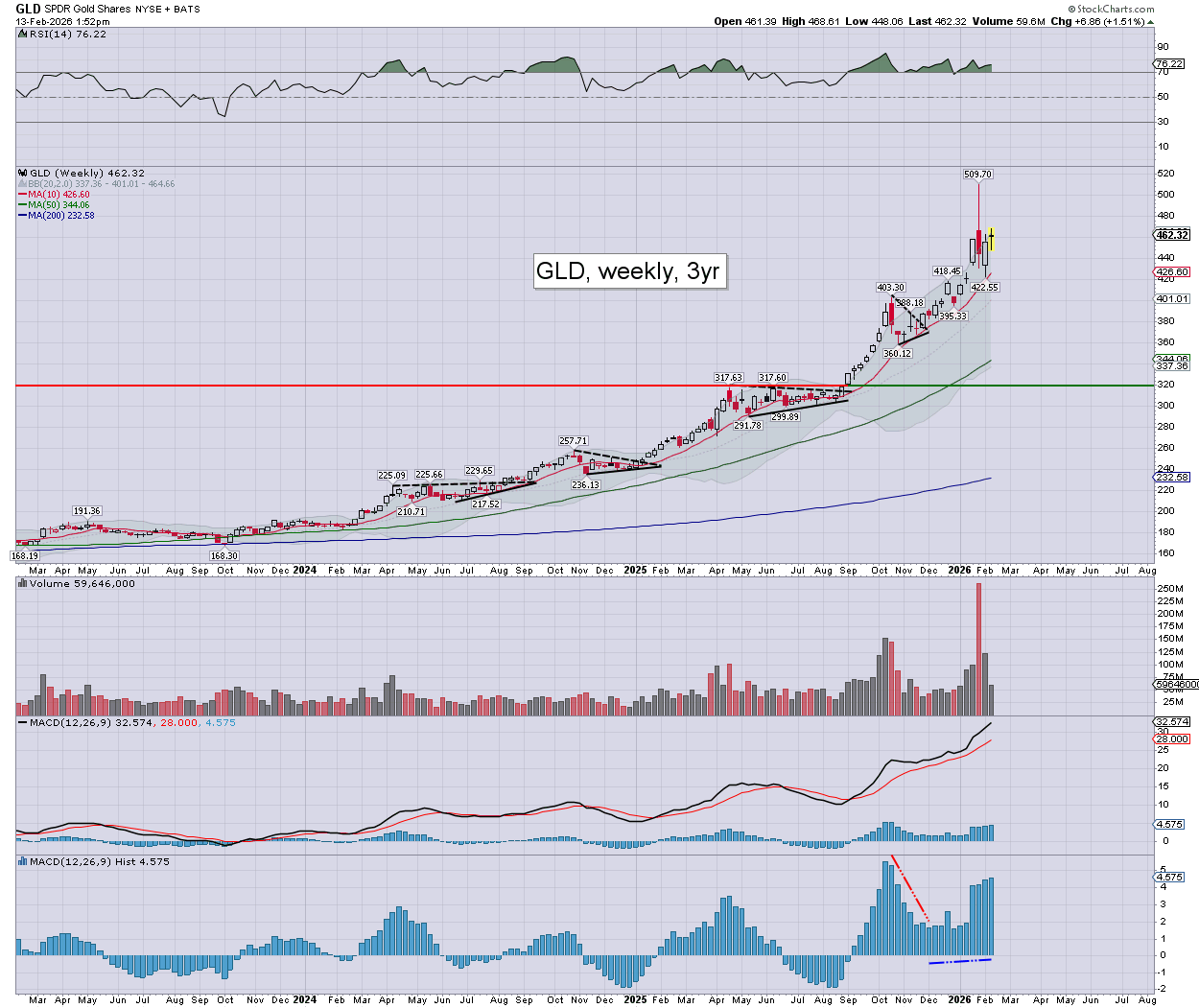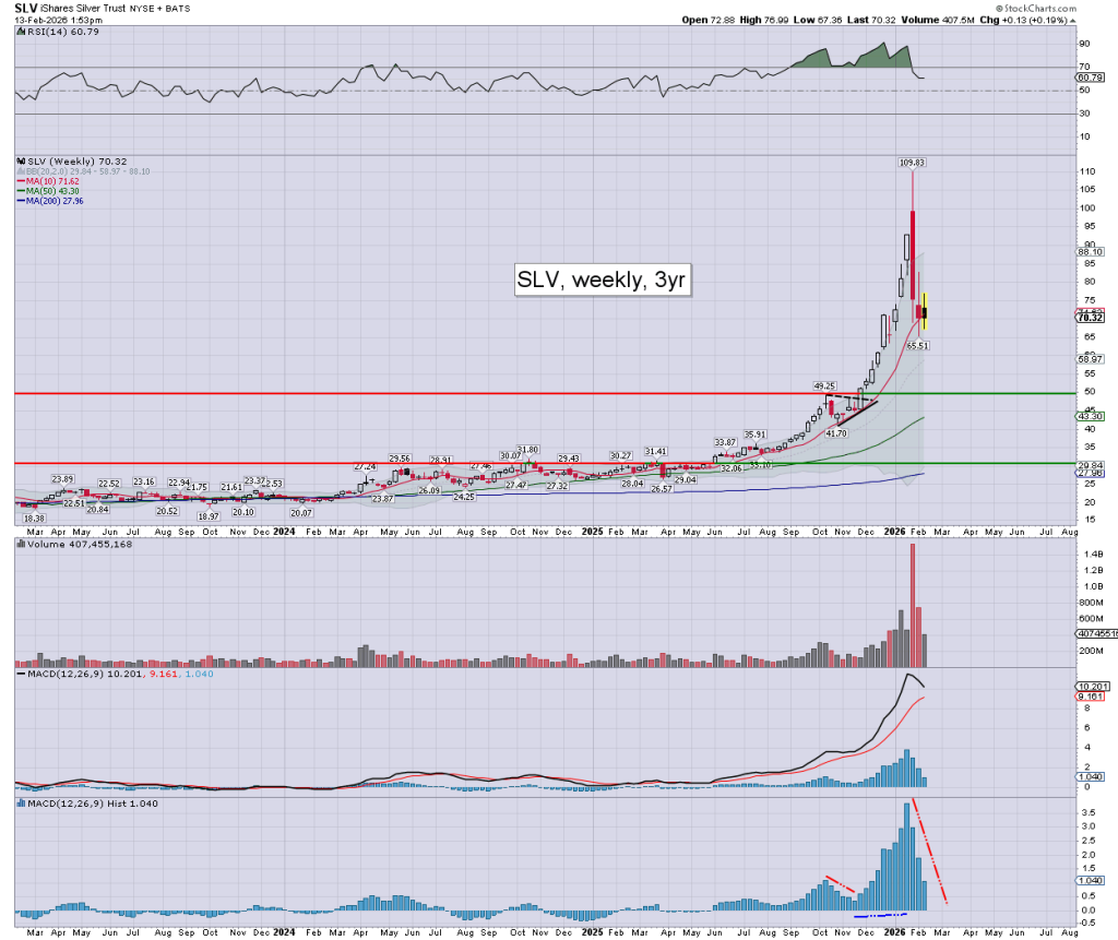 Gold/GLD: currently around $5029. Weekly momentum is on the high side, but there is zero sign of a turn, as gold is holding up far better than silver.