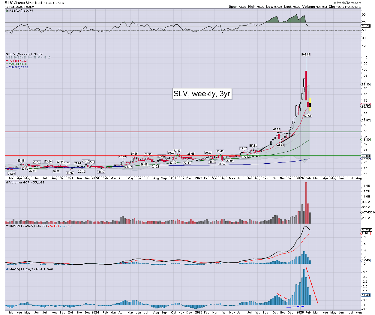 Silver/SLV: currently around $77.71. Weekly momentum prone to turning negative next week.