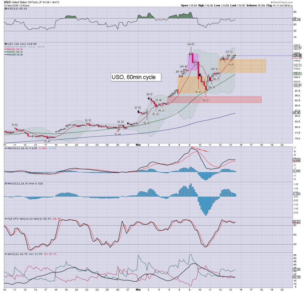 WTIC/USO: a high of $98.09, a low of $92.04, and currently $96s.