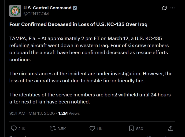 I see overnight news that a KC-135 tanker plane crashed over western Iraq.